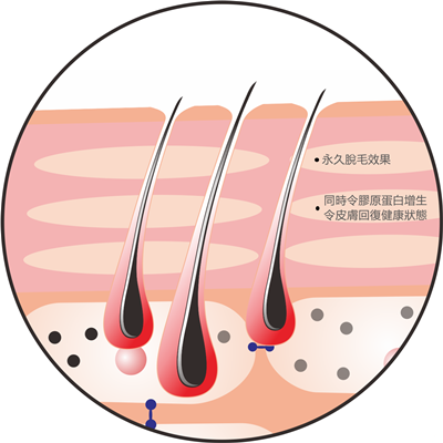 使用 695 -1200nm 波長的 E 光,使毛囊組織中的黑色素吸收,黑色素細胞吸收後轉化為熱能,射頻能會傳導至皮下組15mm,光能熱量和射頻能熱量同時作用於毛幹及毛囊,使毛囊組織溫度提高和通過毛髮對光能的選擇性吸收,從而破壞毛囊組織,另透過表皮冷卻技術,避免細嫩的皮膚在溫熱效應中灼傷,使顧客在清涼舒適的情況下達到理想的脫毛效果,同時改善因刮毛而留下的色素沉澱及毛孔粗糙。